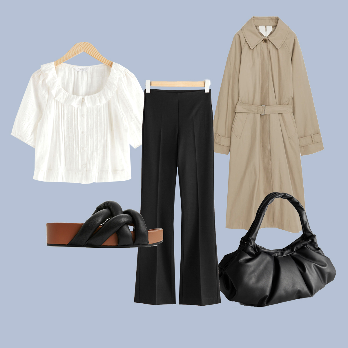 Das letzte Outfit taufe ich „The Classy One“. Für diejenigen, die Mode mögen, aber sich nicht im Papageienkostüm sehen. Sie präferieren eher den zeitlosen Stil, der über Jahre hinweg tragbar und modern aussieht. Das ist möglich, zum Beispiel mit einem gut sitzenden Trenchcoat. Gab es jemals eine Zeit, in der Trenchcoats out waren? Ich glaube nicht. Zu der High-Waisted-Schlaghose von & Other Stories kombiniert „The Classy One“ eine puffy Ledertasche, die ein bisschen an die Bottega-Veneta-Clutch erinnert, aber geräumiger ist und nur einen Bruchteil davon kostet. Dann noch globige Sandalen im Stil von Isabel Marant und eine luftige Bluse, die an einen Urlaub in der Provence erinnert. Viel mehr Klasse geht eigentlich kaum.