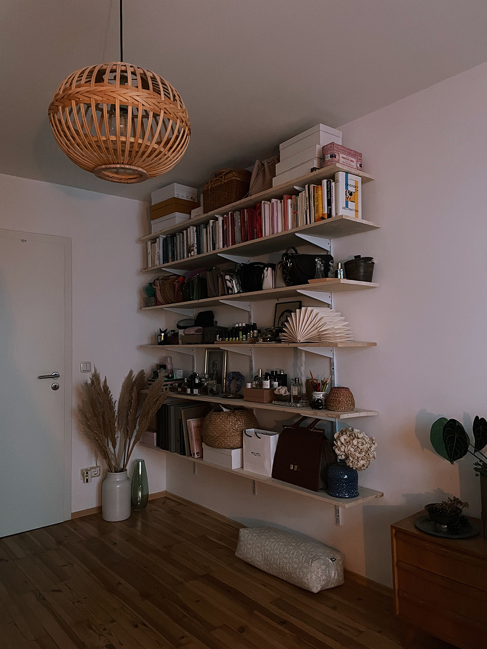 Am Wichtigsten war mir beim Einzug eines: endlich genug Stauraum für all meine Taschen, mein Arbeits-Equipment, meine Beautyprodukte und all die Dinge zu haben, die mir so zugeschickt werden. Also baute ich gleich drei Regale auf, und war tatsächlich erstmal sehr zufrieden mit so viel Verstau- und Abstellfläche.