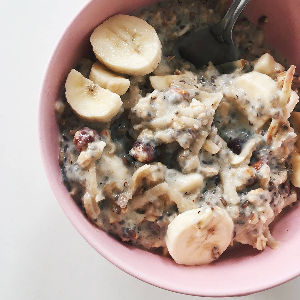 Die Chiasamen mit Sojamilch übergießen und mindestens eine halbe, wenn nicht eine ganze Stunde auf die Seite stellen. Das Müsli in einem Topf ebenfalls mit reichlich Sojamilch übergießen, kurz aufkochen und 15-20 Minuten quellen lassen. Den Apfel mit Schale reiben, die Banane klein schneiden. Aufgequollene(hier schöneren Begriff einsetzen) Chiasamen und geriebenen Apfel unter das aufgequollene(hier ebenfalls) Müsli mischen, 1-2 EL Naturjoghurt und Zimt unterrühren und das Ganze noch mit 1-2 EL Joghurt toppen. Lässt sich wunderbar mitnehmen oder auch gleich essen!