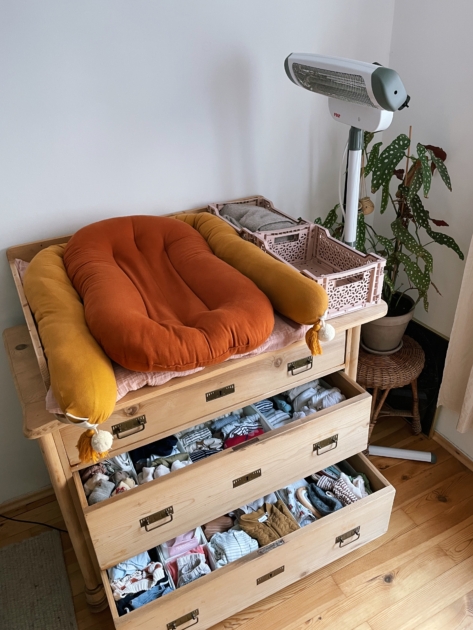 Eine der allerersten Anschaffungen war die Wickelkommode. Schon seit den ersten warmen Tagen hielt ich auf den Hofflohmärkten nach Babysachen Ausschau, was auch erstaunlich gut funktioniert hat – sowohl meine Grundausstattung an Bodys und Stramplern, aber auch Strumpfhosen, Mützen, Socken, Spucktücher oder kleine Pullis habe ich auf Flohmärkten gefunden, und dazwischen sogar Wollwalk- oder Wolle-Seide-Teile von Hessnatur und Co., zwar auch in etwas größeren Größen, die aber das ganze Jahr über gehen und die wir sicherlich auch brauchen werden. Nach einer Kommode mit genug Platz für die Klamotten suchte ich also schon vor einigen Monaten und fand sie bei Nora Kherredine, die sogar einen Wickelaufsatz vom Schreiner dafür hatte anfertigen lassen. Ich wollte kein Ikea-Teil, sondern hatte mir eine alte Holzkommode gewünscht und liebe dieses Möbelstück, das künftig auch ohne Aufsatz in diesem Zimmer bleiben wird. Dazu kam mittlerweile eine Wickelauflage, ein schmaleres Stillkissen hat hier auch erstmal seinen Platz gefunden, und auch ein Heizstrahler steht jetzt hier – vor allem im Winter wohl wirklich eine gute Idee, wenn das Baby beim Wickeln nichts anhat.