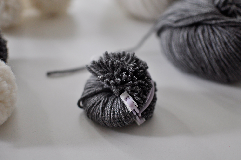 In einem Set gibt es bei Tchibo drei Pompom-Maker in verschiedenen Größen. Ich habe den kleinsten genommen sowie ein Knäuel dicke weiße und eines mit grauer Wolle. Man wickelt die Wolle um den Pompom-Maker, wie auf den Bildern zu sehen ist – je dicker, desto besser. Dann steckt man den Kreis zusammen und schneidet die Wolle an den Seiten auf. Zum Schluss noch mit einem Stück Faden in der Mitte zusammenbinden und ein paar Doppelknoten machen.