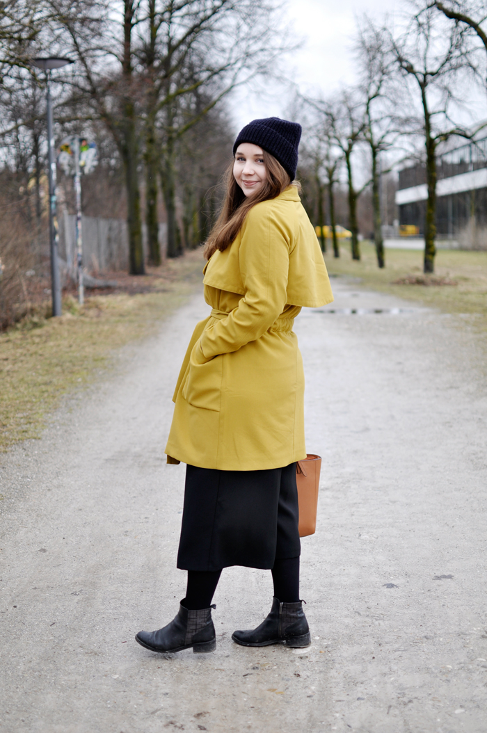 Der staubgelbe Edited Trenchcoat, den ich mir aus der neuen Kollektion aussuchen durfte, kam jetzt aber gerade recht, um die Sache mal zu testen. Leider noch nicht in der frühlingshaften Variante, dafür aber mit Culotte 2.0, die mit Strumpfhose auch an kalten Tagen geht. Gelb heute also passend zum Regenwetter erstmal zu Schwarz und Dunkelblau, sobald es wärmer wird dann aber auch zu Frühlingsfarben!
