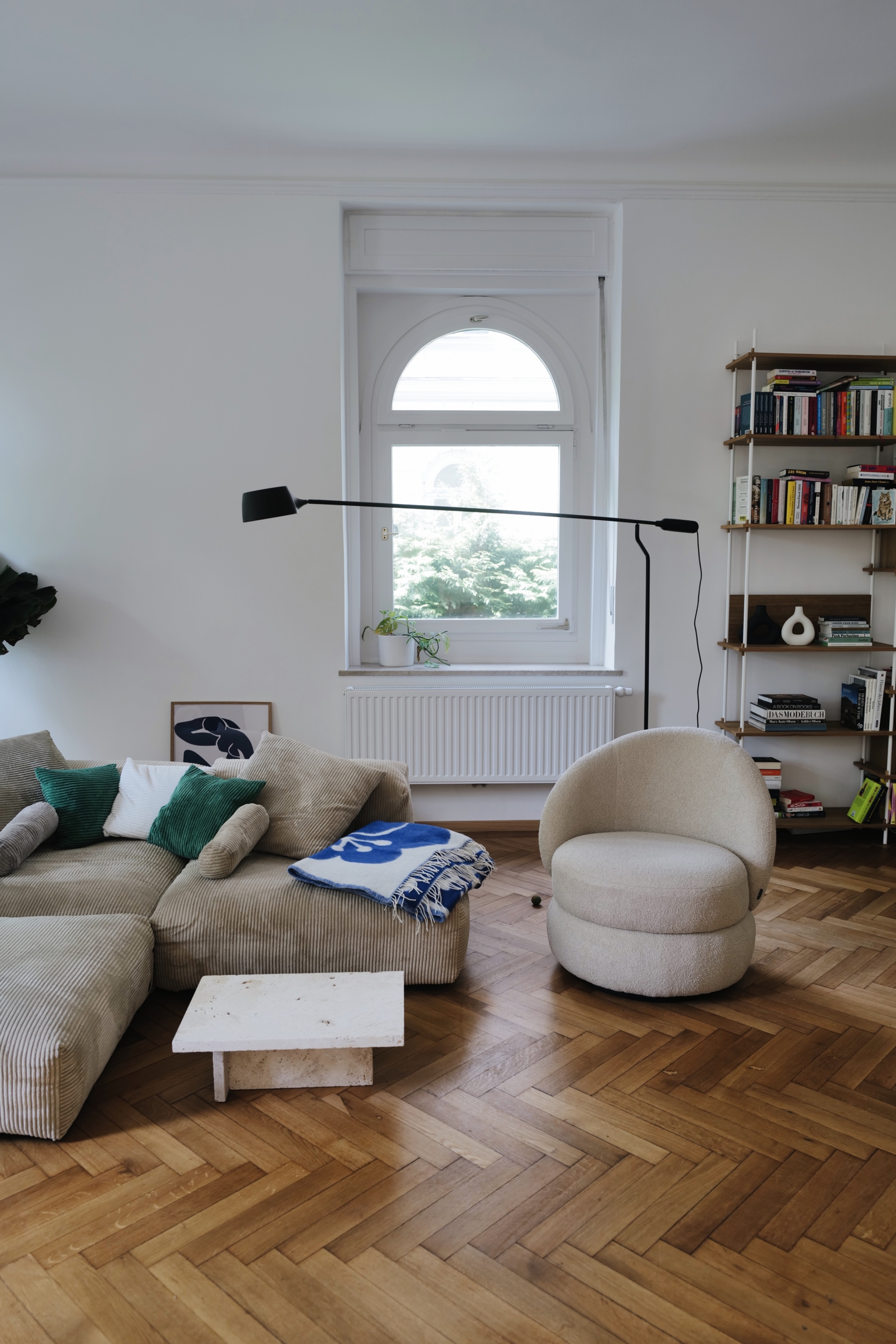 Vier Monate wohnen wir schon in unserer Wohnung, langsam fühlt sich das Zuhause auch wie ein Zuhause an. Auch wenn wir immer noch keinen Spiegel im Bad haben, mein Arbeitszimmer gerade noch Abstellkammer ist und die Schranktüren für den Kleiderschrank noch auf sich warten lassen. Aber wir haben ja keine Eile. Dafür ziehen immer mal wieder ganz besondere Teile bei uns ein. Wie der wunderschöne Sessel Alma von The Sofa Company. Ich liebe die Sessel, da sie nicht nur so wunderbar bequem sind, sondern auch drehbar. Wir können sie ganz flexibel bei uns einsetzen und den Raum im Nu verändern. Momentan steht der Sessel vor unserem Leseregal im Wohnzimmer, zum Fernsehschauen, Bücher lesen oder mit Freund:innen quatschen. Manchmal ist er aber auch einfach Spielplatz für Minnie. So oder so ist er ein Lieblingsstück von uns allen – und ich sage Danke an The Sofa Company für dieses Geschenk.