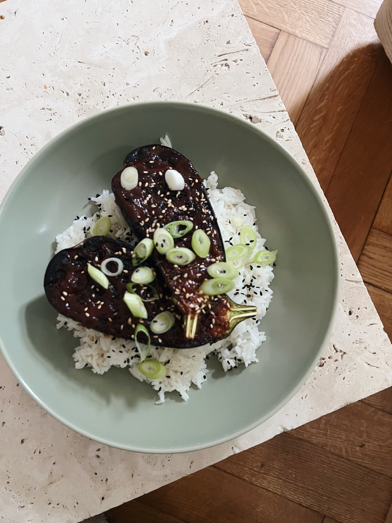 Es sieht fancy aus, ist aber ganz leicht gemacht: die Miso glaced Aubergine mit Reis und Frühlingszwiebeln. Aubergine halbieren und kurz anbraten, dann mit Misopaste und Gewürzen bestreichen und in den Ofen schieben. Sobald sie weich und glasiert wirkt, herausnehmen, mit Sesam und Frühlingszwiebeln bestreuen und mit Reis servieren. Und wem’s zu trocken ist: Sojasauce dazu! Ich liebe das Rezept, weil es die langweilige Aubergine nochmal spannender macht – und gesund ist es auch noch.