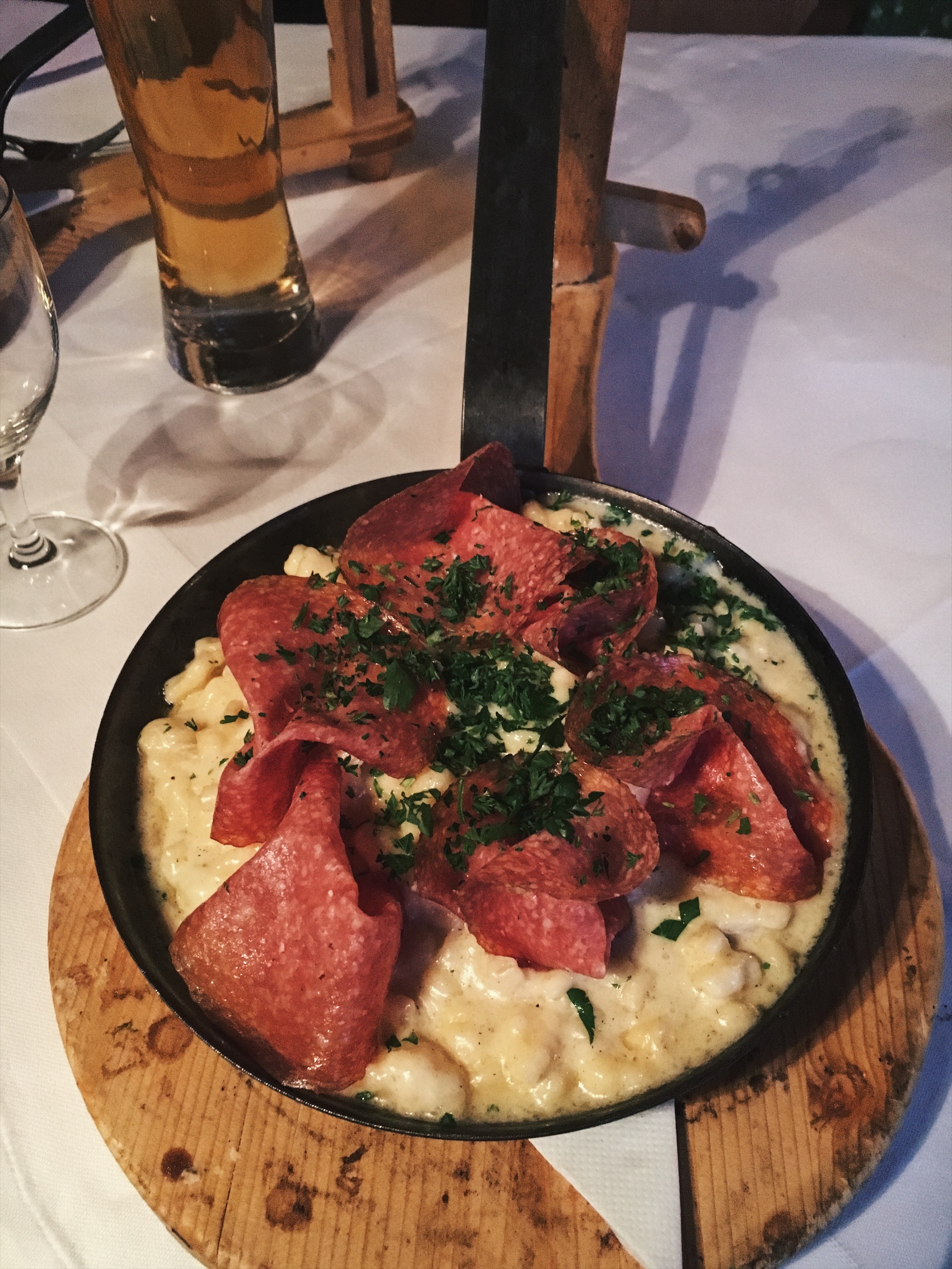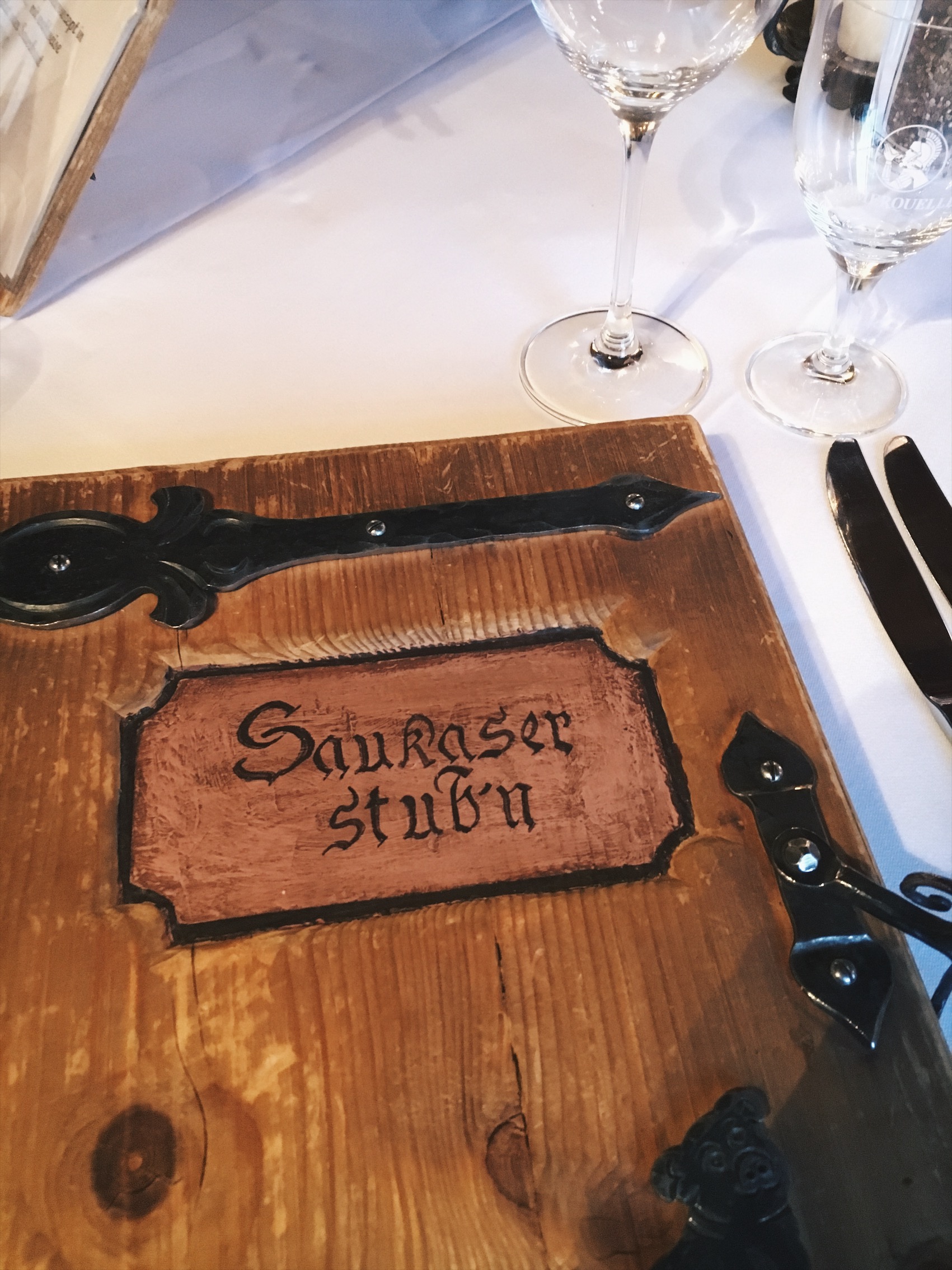 Am Freitagnachmittag widmeten wir uns nach der Arbeit also ganz der Entspannung im riesigen Spa-Bereich. Wir erkundeten die Saunalandschaft, gingen schwimmen und atmeten bei dem absurden Panoramabild auf die Alpen durch – wie man das halt so macht, wenn man die Möglichkeit hat, in so wunderbaren Räumlichkeiten zu hausen. Am Abend kehrten wir in der Dorfwirtschaft Saukaser Stub’n ein – einem gehobenen Restaurant mit urigem Einschlag. So begab es sich, dass Amelie ihre vegane Ernährung für dieses Wochenende über den Haufen warf und sich den Trüffel-Kasspatzn inklusiver Trüffelsalami hingab. Nach so einer langen Abstinenz hat das Ganze noch viel besser geschmeckt.