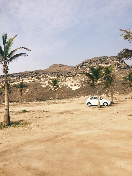 Ein bisschen nervös sind wir, nur in unseren Badeanzügen, während ein paar hundert Meter entfernt zwei Frauen im Burkini schwimmen. Wir haben uns extra nicht mehr in Sichtweite der wenigen anderen Badegäste des öffentlichen Strandes positioniert, um die auch hier weit verbreitete Kultur der weiblichen Verschleierung mit Respekt zu behandeln, doch plötzlich läuft ein traditionell gekleideter Mann in bodenlangem, weißen Gewand und der typisch omanischen Kappe vorbei. Wir sind gerade aus dem Wasser gestiegen und wickeln uns eilig die Handtücher um, da grinst er uns an, winkt, und spaziert weiter. Wir sehen ihm noch hinterher, da kommt ein schwarzer, glänzender Mercedes vor uns auf dem weißen Sand entlanggefahren, wieder wird uns fröhlich zugewunken. „Moderne trifft auf Tradition“, so hatte es in den Reiseführern gestanden. Und so langsam begreifen wir, was es mit dieser völlig verrückten Mischung in diesem Land auf sich hat.