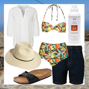 Top: Edited / Sonnenbrille: Miu Miu / Bronzer & Highlighter: Artdeco / Tanning Lotion: Hampton Sun / Jeansjacke: Mexx (Sale!) / Sandalen: Topshop / Nagellack: YSL / Clutch: Gretchen / Shorts: Topshop