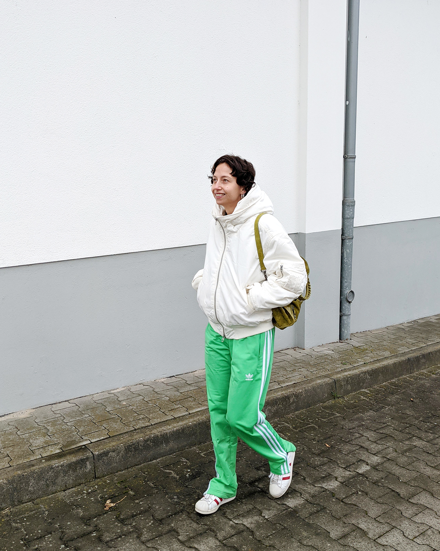 Adidas Hose – Weiße Bomberjacke – Vintage Balenciaga Bag – Adidas Superstars