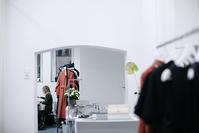 Die Preise sind bezahlbar, die Produktion nachhaltig und fair, denn die einzelnen Designs entstehen vor Ort im Laden. Für schlappe 110 Euro werde ich mir ein Seidentop kaufen, das auf Bestellung extra für mich geschneidert wird – made to order. Da zuppelt nichts, da ziebt nichts und es bleibt vor allem wenig am Ende der Saison auf den Stangen hängen. Nach dem arabischen Sommer der letzten Kollektion fließen in der Herbst/Winter Kollektion asiatische Elemente ein – um nur mal das Key Piece der Kollektion, der Seidenkimono in sattem Orange, als Beispiel zu nennen.