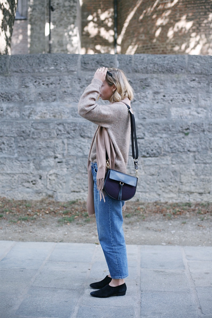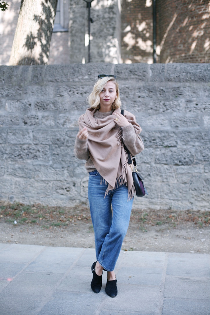 Schal: Acne Canada Scarf Camel, Pullover: H&M (ähnlicher hier), Jeans: Monki, Tasche: Thanks to Closed, Sonnenbrille: Acne Studios, Loafer: & Other Stories (ähnliche hier), Kette: Stadtelster, Ring: Maria Black