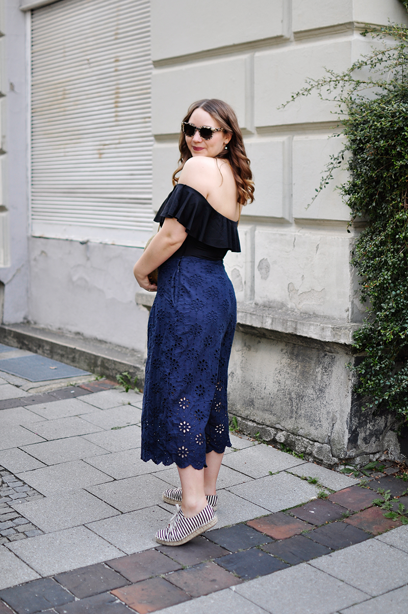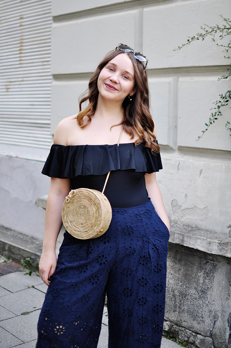 Der Spätsommer läuft gerade nochmal richtig zu Hochtouren auf, weshalb ich mein Outfit, das eigentlich schon halb im Koffer für die morgige Reise an heiße Strände lag, nochmal hervorgeholt habe – um es einfach in München zu tragen. So heiß wie es gerade ist, geht das nämlich genauso gut. Es besteht wie momentan so gut wie immer aus einem Badeanzug, hier in der Off-Shoulder-Variante, was sich am allerbesten als Top tragen lässt. Dazu kommt die Culotte mit Lochmuster von mint&berry aus dem letzten Jahr und meine neue runde Strohtasche, die ich den ganzen Sommer über angeschmachtet, aber jetzt erst bestellt habe, besser spät als nie eben.