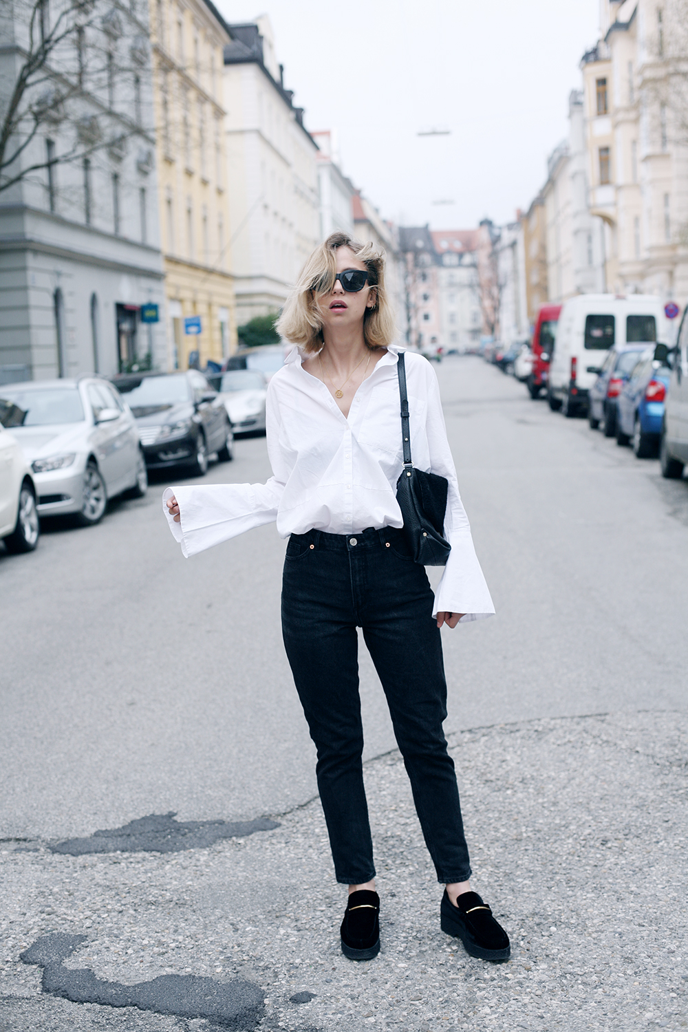 Loafer: Céline, Mom Jeans: Asos, Hemd: Edited the Label (ähnliches hier), Tasche: See by Chloé (ähnliche hier), Jacke: H&M (ähnliche hier), Kette: Jane Koenig, Sonnenbrille: Acne Studios