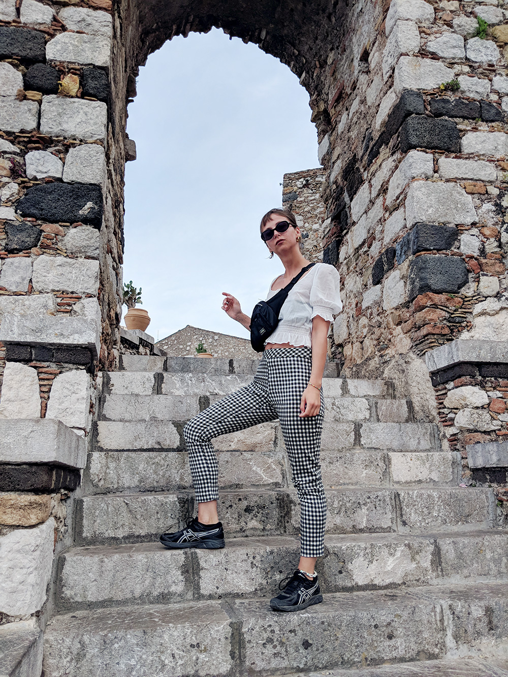 Eigentlich hatte ich wirklich nicht vor, ein 2. Outfit in unserem Urlaub auf Sizilien zu fotografieren. Doch als sich unser Trip dem Ende zuneigte, und ich aus meinem spärlich gepackten Handgepäcksköfferchen meine letzten frischen Kleidungsstücke zu eigentlich schon zu oft getragenen Kleidungsstücken kombinierte, die ich im Alltag in Berlin vermutlich bereits in die Wäsche getan hätte, beäugte ich mich im Spiegel und befand das Outfit des letzten Tages in Castelmola, Sizilien für: gut.
