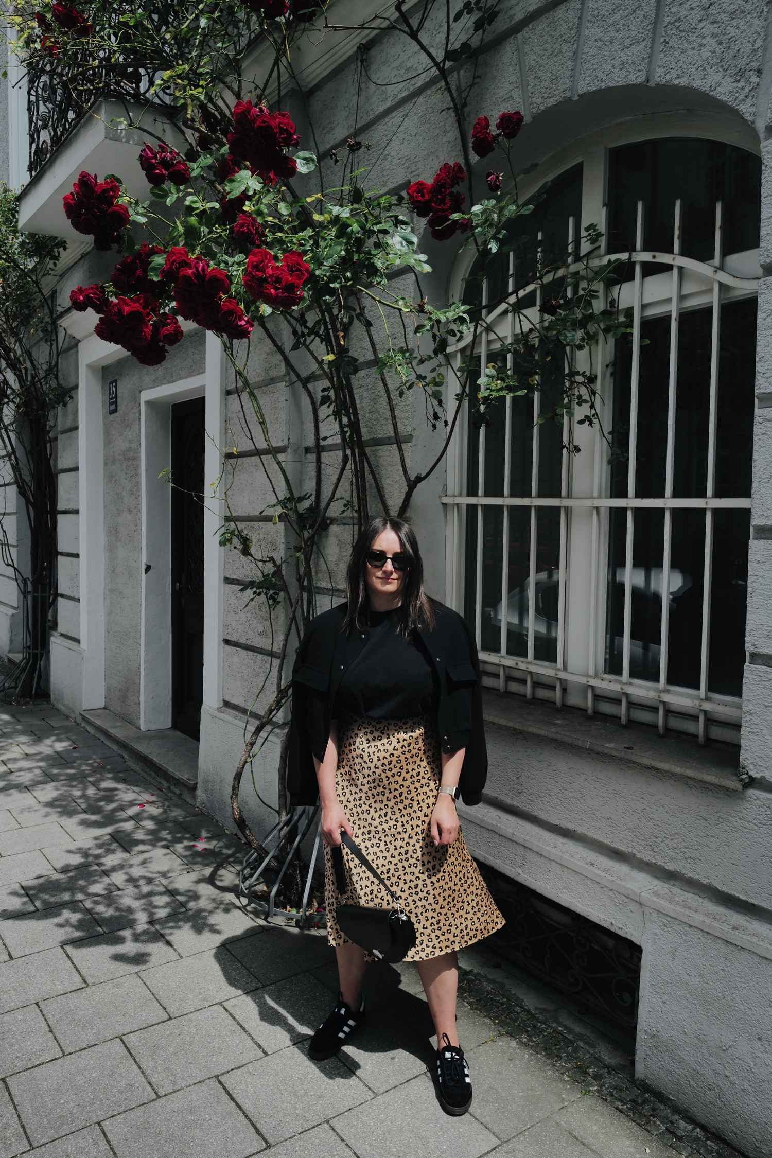 Als ich dieses Mal mit dem Leo-Rock vor dem Spiegel stand, entschied ich mich, mir treu zu bleiben, viele schwarze Teile dazu zu kombinieren und einzig mit der Bomberjacke mit Schulterpolstern so ein bisschen Aufregung dazu zu addieren. Ob’s mir gelungen ist? Vor dem Spiegel war ich unsicher, mittlerweile sage ich: Ja, so kann man herausgehen. Ich mag den Look, ich mag den Rock, ich finde die Länge an mir okay. Ich erfinde damit das Rad sicherlich nicht neu, aber so schließe ich Frieden mit mir und dem Midi-Rock.