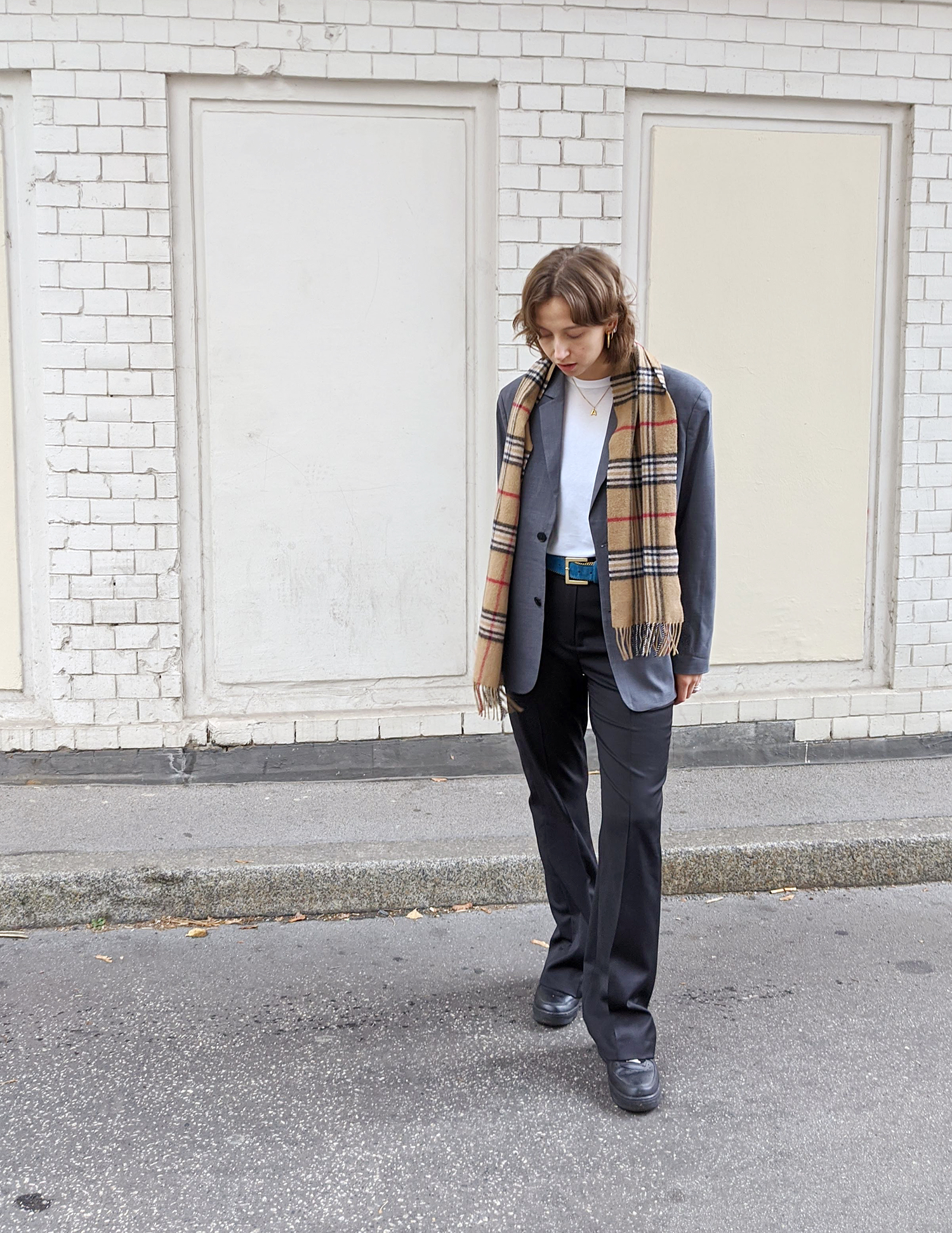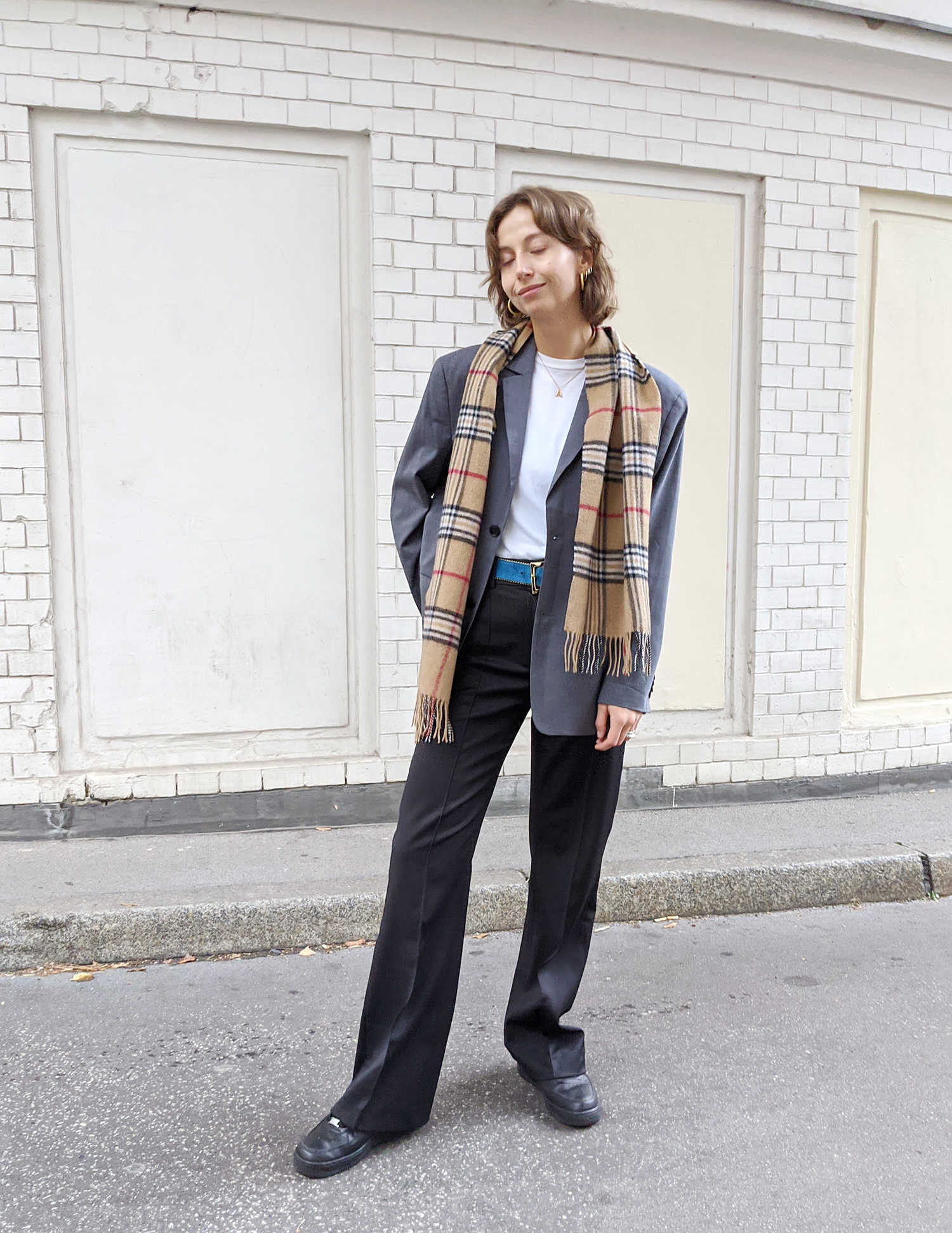 Ich finde das Outfit ehrlich gesagt grauenvoll. Alles schreit nach billig und plastik. Hose, Blazer und Schal sind komplett formlos. Bin erschreckt, was die Fashionblogger heutzutage als Outfit zeigen.