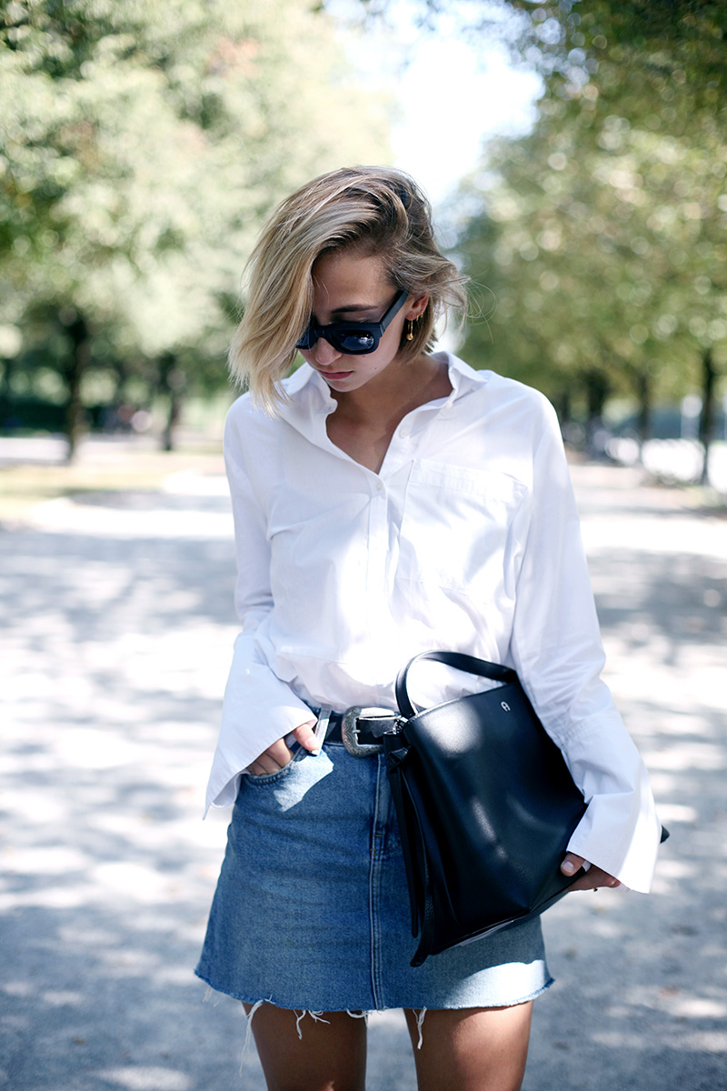 Das schöne am September-Sommer ist aber, dass ich meine letzten Sommeroutfitkracher jetzt noch mal raushauen kann, weil „jetzt oder nie“. Die Frage, was ich heute anziehen soll, fällt mir dementsprechend leicht. Natürlich den Minirock. Natürlich die Sandalen. Natürlich die Shorts. Alles was kurz ist und was im Herbst und Winter nicht tragbar ist! Ich möchte meinen liebsten Kleidungsstücken schließlich die letzte Ehre erweisen. Heute mache ich das mit dem Jeansrock, den ich den ganzen Sommer über getragen habe, einem weißen Hemd von Edited, um den Isar-Look in seiner Sportlichkeit zu entschärfen, den hübschesten Espandrillos überhaupt und meiner Tasche von Aigner.