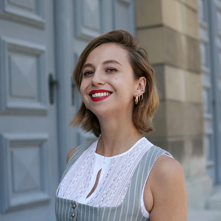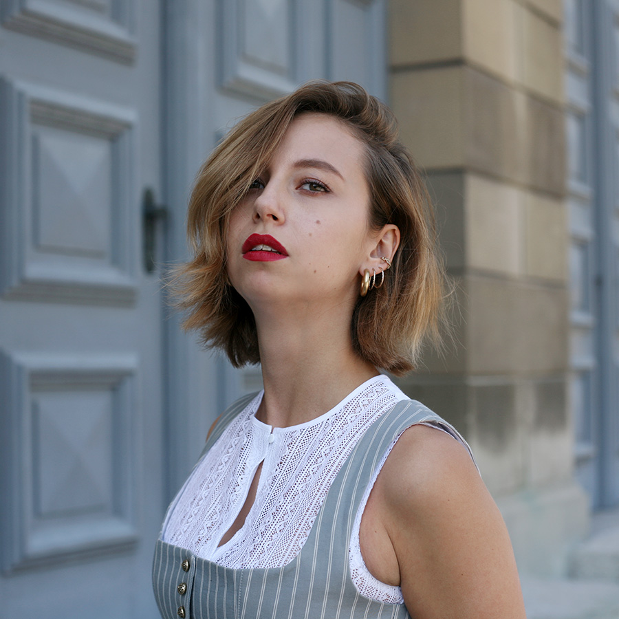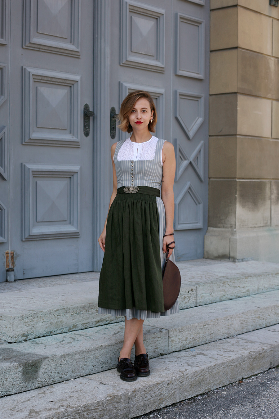 Das Schuhwerk ist auf den heutigen Outfitfotos ein besonders authentisches. Denn so schön Pumps zu einem traditionellen und midilangen Dirndl auch aussehen mögen, am Ende greife ich dann doch zu festen Schuhen zurück, die mich auf der wackeligen Bank nicht noch mehr wackeln lassen. Denn eines kann ich möglichen Wiesn-Neulingen nur mitgeben: zieht euch anständige Schuhe an. Zum Beispiel Doc Martens, die helfen euch garantiert durch einen langen Tag auf dem Oktoberfest! Ich spreche aus Erfahrung.