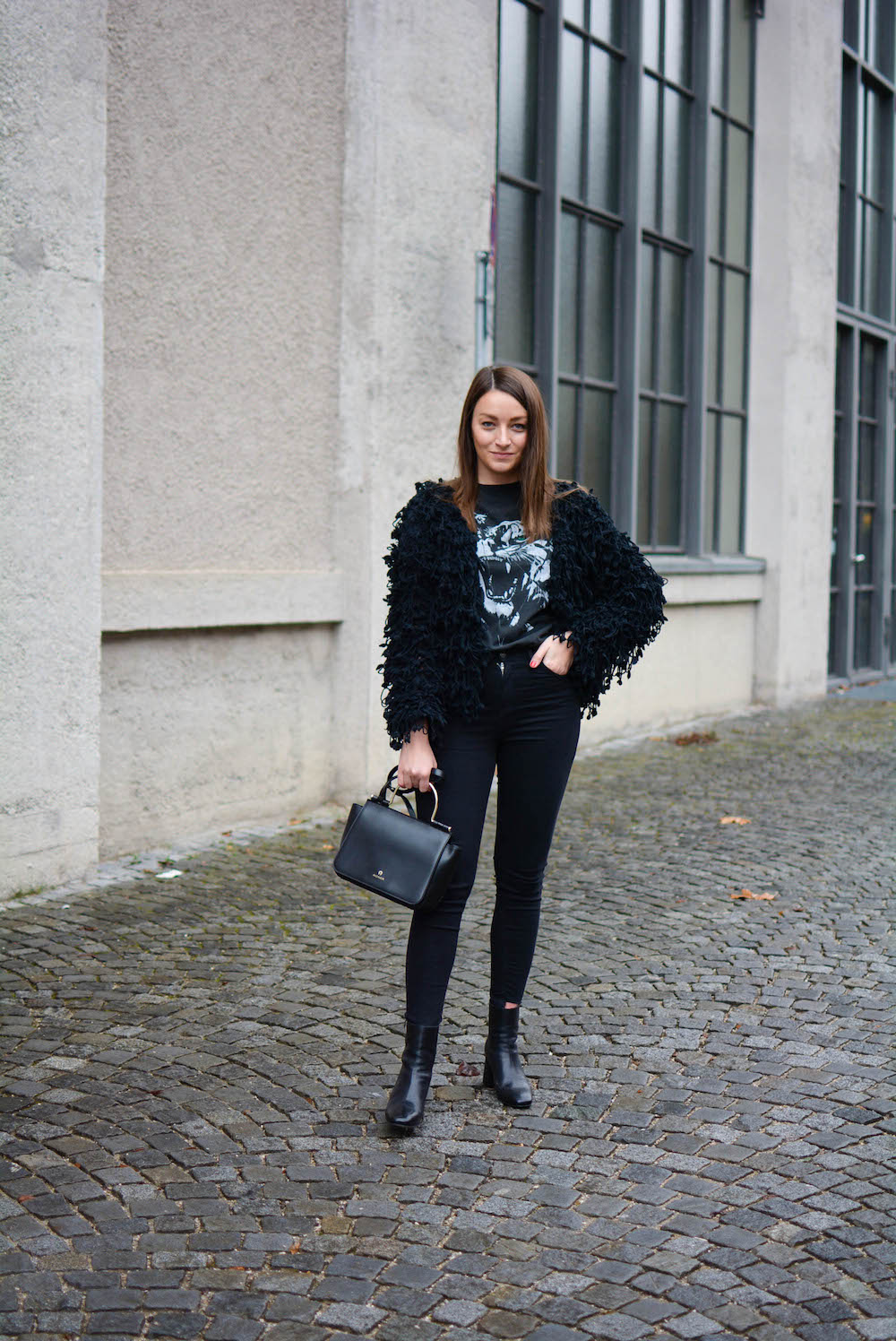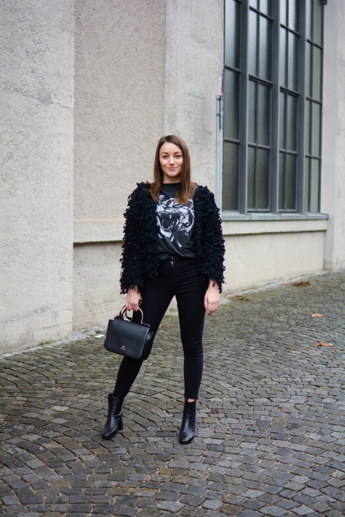 Bevor ich wie ein Glücksbärchen auf und ab springe, zeige ich euch noch mein allerletztes Outfit dieses Jahr. Und auch den Beweis, dass wir 1. immer wieder Opfer unserer eigenen Shoppingcollagen werden, 2. aber vieles auch als Inspiration nachstylen können. Hier trage ich nämlich das T-Shirt, welches ich am Montag in der Shopping-Collage zeigte, mir am Dienstag nicht mehr aus dem Kopf ging und wie aus Zauberhand über die Ladentheke huschte. Kombiniert habe ich es dann aber mit alten Teilen aus meinem Kleiderschrank – denn meistens hat man eben doch so ähnliche Dinge schon. Die Wuscheljacke ist mindestens drei Jahre alt, wird aber immer wieder rausgekramt. Ja, und der Rest ist sowie Basic-Standard bei mir.