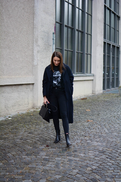 Mantel – Weekday, Strickjacke – Zara (alt, ähnliche hier), T-Shirt – & other stories, Jeans – Topshop, Boots – thanks to Edited, Tasche – Aigner