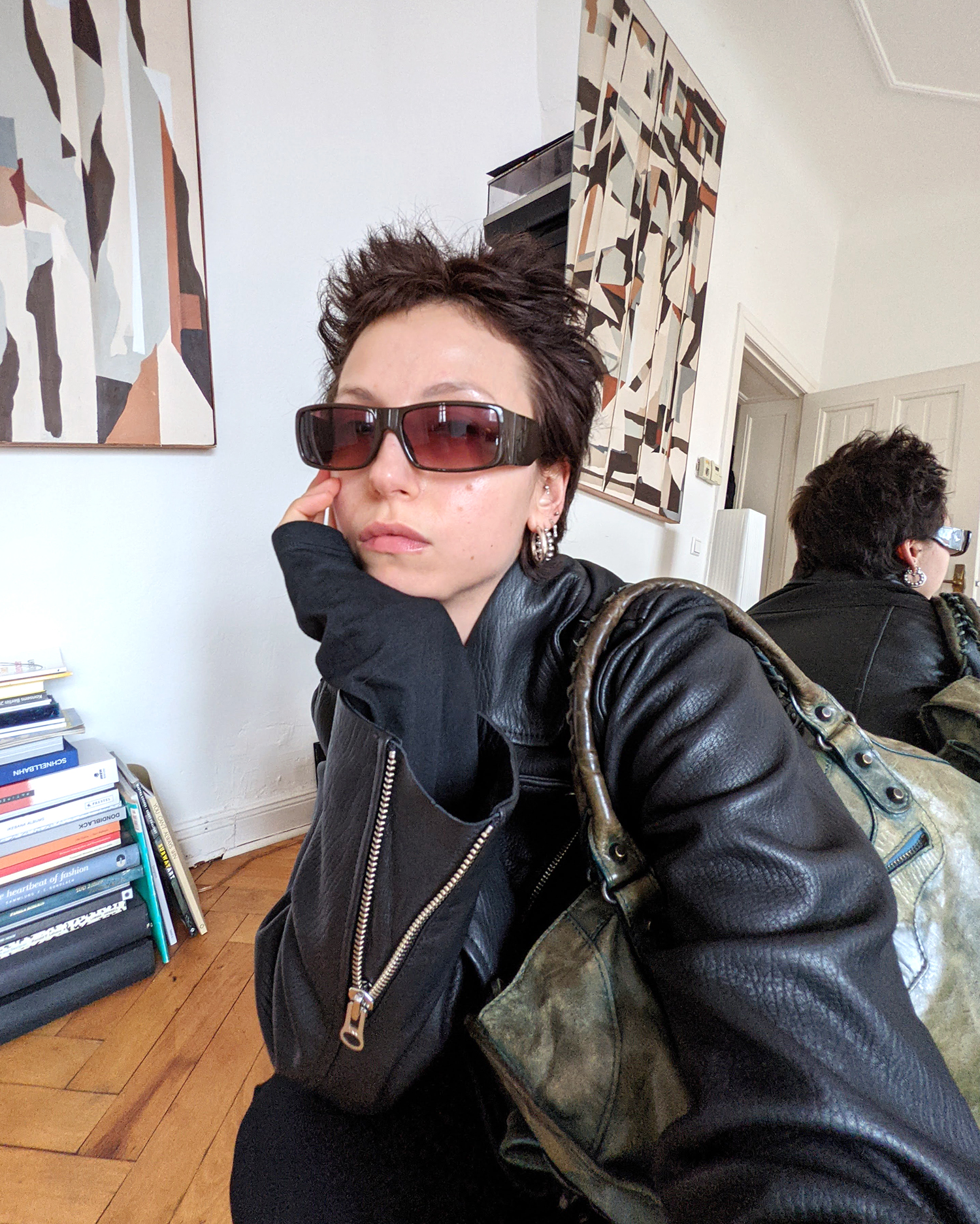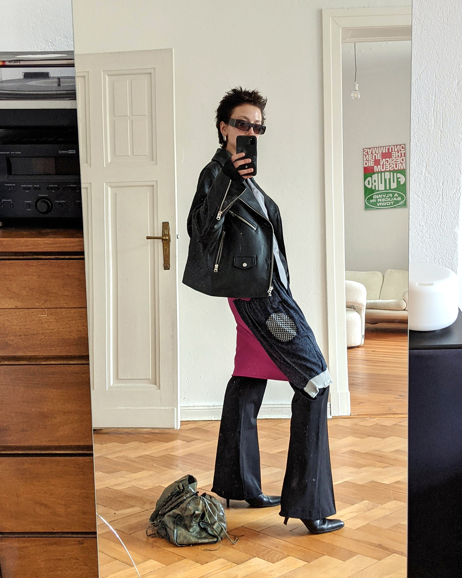 Lederjacke von & Other Stories – Longsleeve mit Daumenlöchern von Staatsballett – Vintage Hose (Ähnliche hier) – Vintage Prada Boots – Vintage Balenciaga Tasche – Vintage Gianfranco Ferré Sonnenbrille