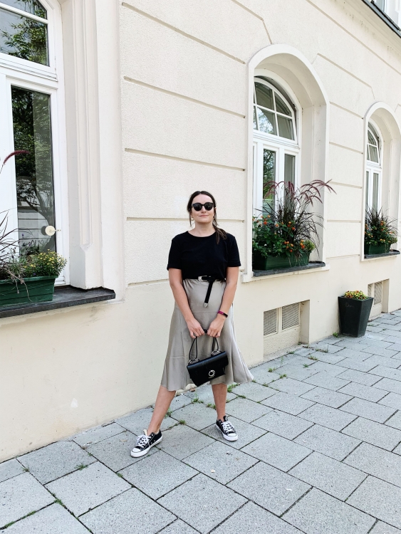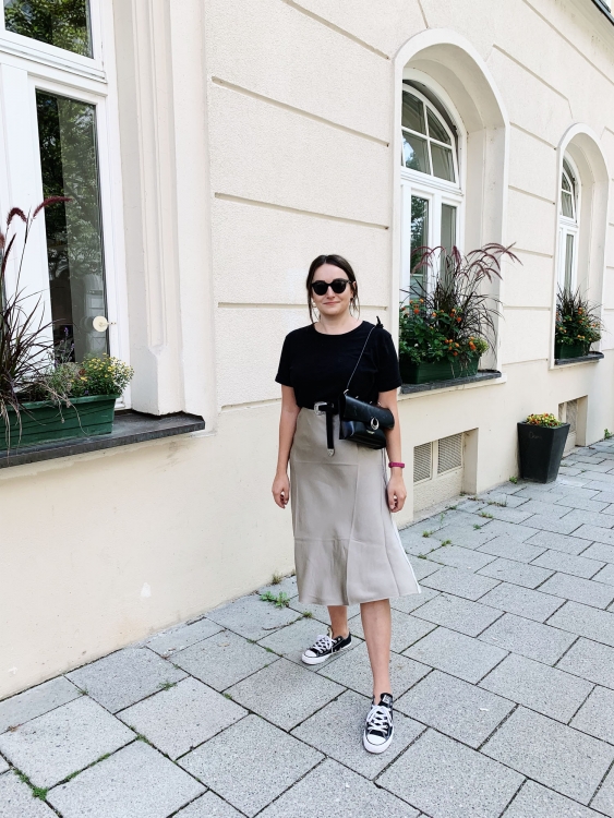Tshirt – Zara (ähnliches hier), Rock – Weekday, Sneaker – Converse (im Sale!), Sonnenbrille – Weekday (alt, ähnliche hier), Tasche – Kozha Numbers, Gürtel – Vintage (ähnlicher hier), Ohrringe – Weekday