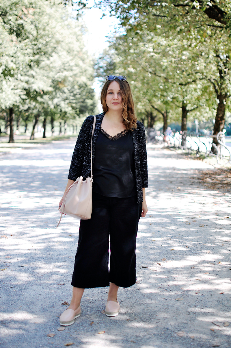 Top: YAS / Culotte: Weekday (Ähnliche hier, hier) / Jacke: H&M (Ähnliche hier) / Schuhe: Lika Mimika (Ähnliche hier) / Tasche: No. 21 (Ähnliche hier) / Sonnenbrille: Ace&Tate