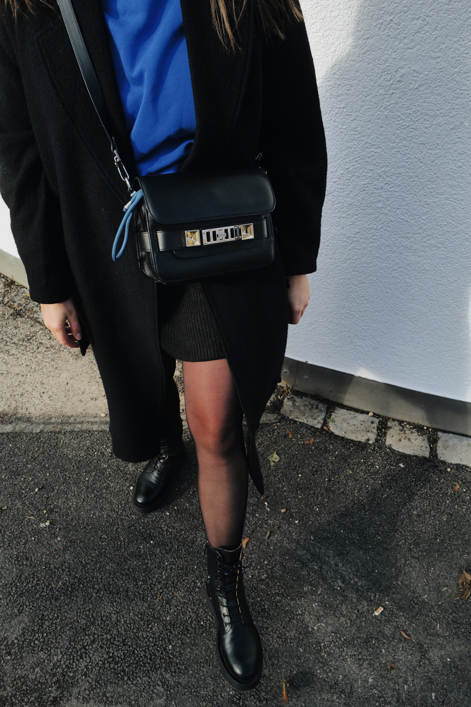 Mantel – & other stories, Pullover- Dariadeh, Rock – Zara (alt, ähnlicher hier), Strumpfhose – Calzedonia, Boots – & other stories, Sonnenbrille – Prada, Tasche – Proenza Schouler