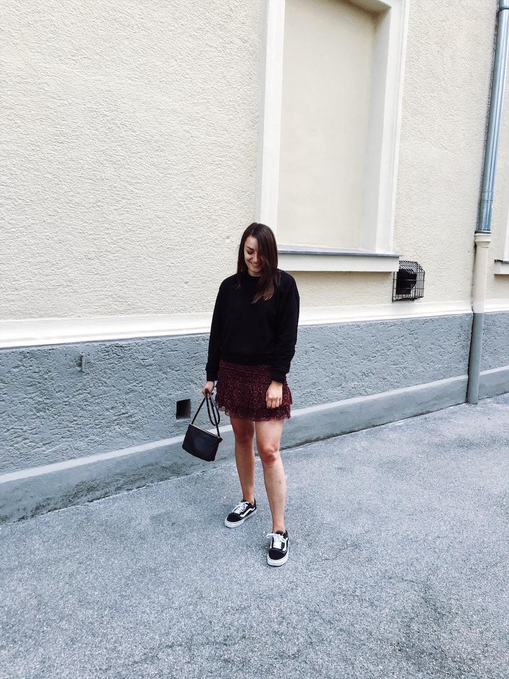 Pullover – Weekday, Rock – Isabel Marant (alt, ähnlicher hier), Jeansjacke – Weekday (ähnliche hier), Sneaker – Vans, Tasche – Celine, Sonnenbrille – Komono
