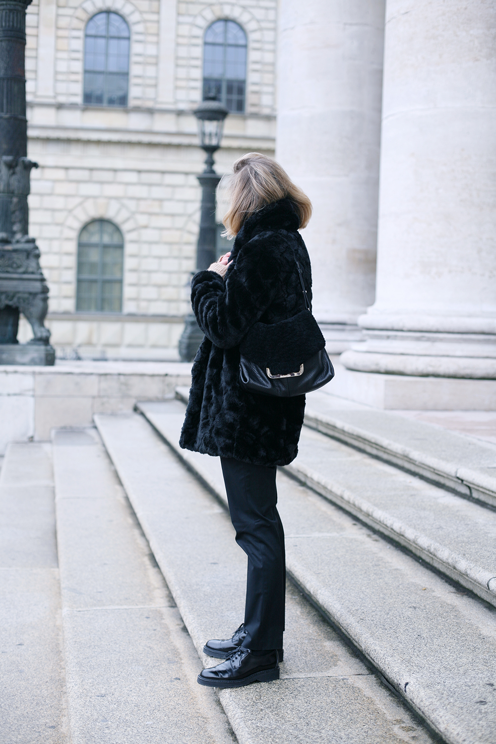 Pullover: Collection No.2, Mantel: French Connection (ähnlicher hier), Hose: Thanks to Colors of Benetton, Schuhe: Prada, Tasche: See by Chloe, Ohrring: Thanks to Jane Konig