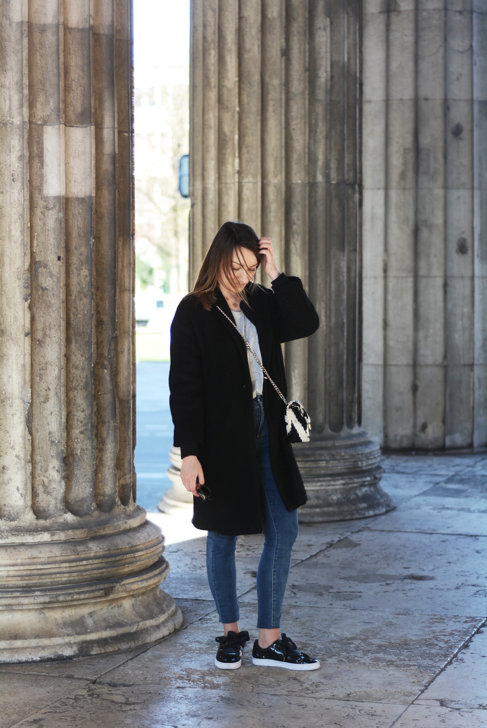 Mantel – Mango, Bomberjacke – Topshop (ähnliche hier), Tshirt – H&M (ähnliches hier), Jeans – Topshop, Sneaker – Puma, Tasche – Rough Studios, Sonnenbrille – thanks to Viu Eyewear, Ketten – thanks to Jane Koenig
