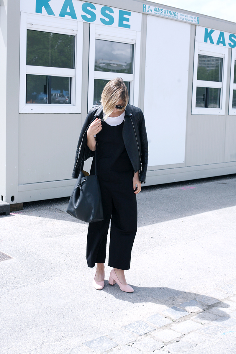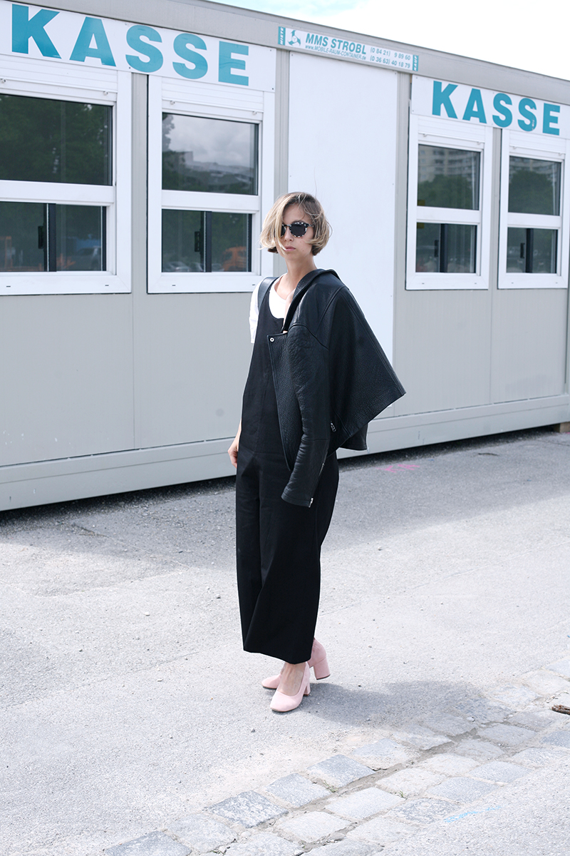 Jumpsuit: Baserange thanks to Mox Store, Pumps: Asos (Rot / Schwarz), Shirt: Hope (ähnliches hier), Sonnenbrille: Han Kjobenhavn, Bucket Bag: Steve Mono (ähnliche hier), Lederjacke: Topshop Boutique