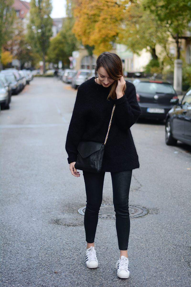 Pullover – H&M Trend (ähnlicher hier), Lederhose – thanks to Muubaa (ähnliche hier), Sneaker – Adidas, Tasche – thanks to Beliya, Armreifen – thanks to Sabrina Dehoff, Lippenstift – Maybelline „Keep it classy“, Nagellack – Essie „Wicked„