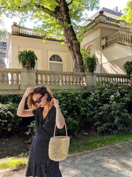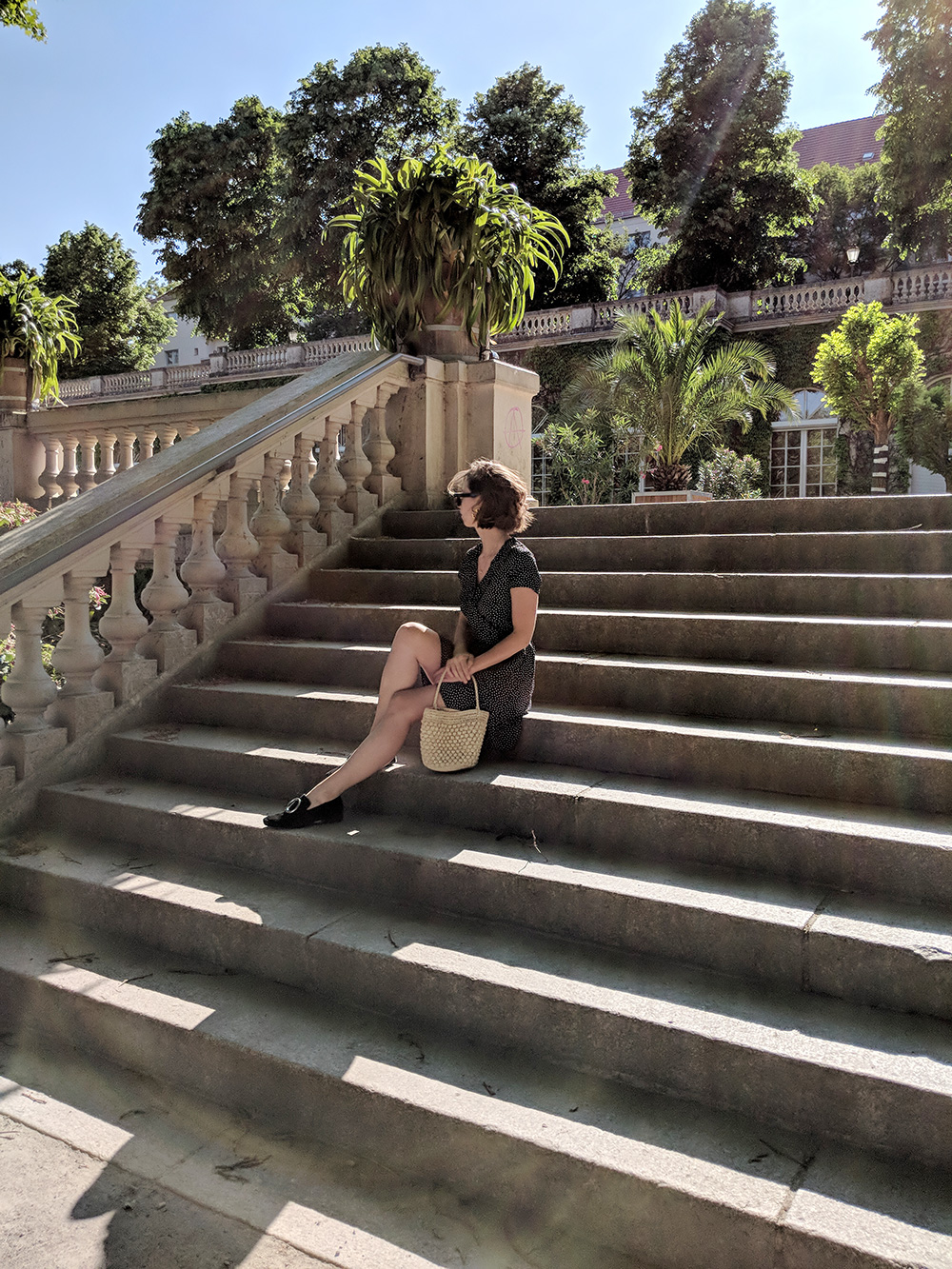 Der Duft von Zitronenschalen, ein Blick auf Olivenplantagen, ein Caffè am späten Nachmittag: Mich hat die Leichtigkeit des Dolce Vita gepackt und ich kann nicht anders, als sie im Berliner Körnerpark – ein fantastischer Italien-Ersatz – auszuleben. Die herrlichen schwül-sommerlichen Temperaturen geben meinem Jake*s Wickelkleid die nötige Bühne, da ich mich seit dem ersten Mal Ausführen ganz abgöttisch in das Kleid verliebt habe und es diesen Sommer sicherlich noch öfter tragen werde.