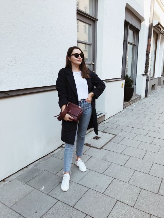 Mantel – thanks to Edited (ähnlicher hier), T-Shirt – Reformation (Fair Fashion), Jeans – Weekday (alt, ähnliche hier), Sneaker – Adidas, Tasche – thanks to Aigner, Sonnenbrille – Weekday (ähnliche hier),