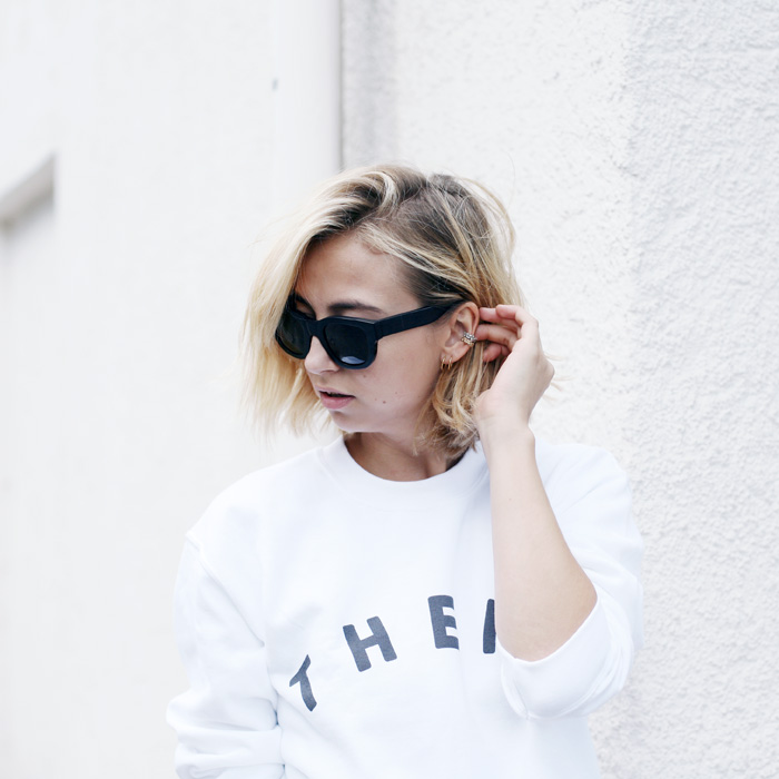 Kaum verliert Antonia einen Kommentar zum Thema Print Sweater, habe ich wenige Tage später einen bei mir im Schrank hängen. Denn auch ich bin zwiegespalten, was die Pullover angeht – irgendwie prollig, irgendwie sinnbefreit, irgendwie aber auch geil. Und dann auch noch in Weiß! Tragen konnte ich ihn diese Woche tatsächlich aufgrund der kurzen Hochsommerpause, die das Wetter eingelegt hat und die mir ganz gelegen kam. Kurz durchatmen, endlich wieder schlafen können und lange Hosen und Pullover tragen (manchmal ist es eben ganz nett). Kombiniert habe ich den Pulli zu meiner Flared Jeans von Monki, in die ich unsterblich verliebt bin und die schätzungsweise die erste Schlaghose ist, die in meinen Augen nicht aufträgt.