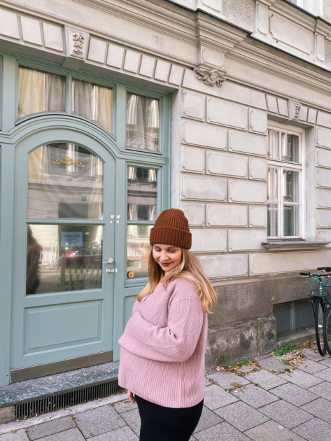 Gerade ist es eine besonders große Veränderung für mich, in den Herbst ohne Termindruck und Arbeit im Kopf zu gehen, wie sonst in jedem anderen Jahr. Und zum ersten Mal in dieser Jahreszeit Entschleunigung zuzulassen. Die Tage bis zum Geburtstermin werden immer weniger, und ich versuche mich mental auf die großen Veränderungen einzustellen, die bald auf mich zukommen. Immer dabei ist gerade eine weiche Schwangerschafts-Schlaghose, das offiziell bequemste Kleidungsstück, das ich je getragen habe. Außerdem weiche, warme Pullis wie dieser Kaschmirpulli, und bequeme Schuhe – für mich sind New Balance in Sachen Bequemlichkeit ganz weit vorne. So gehe ich also in die letzten Wochen vor der Geburt – so gemütlich und entschleunigt wie möglich und mit viel Respekt und Vorfreude auf die Veränderungen, die dieses ganze Abenteuer noch für mich bereithält.