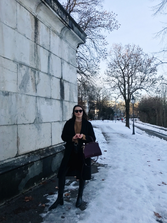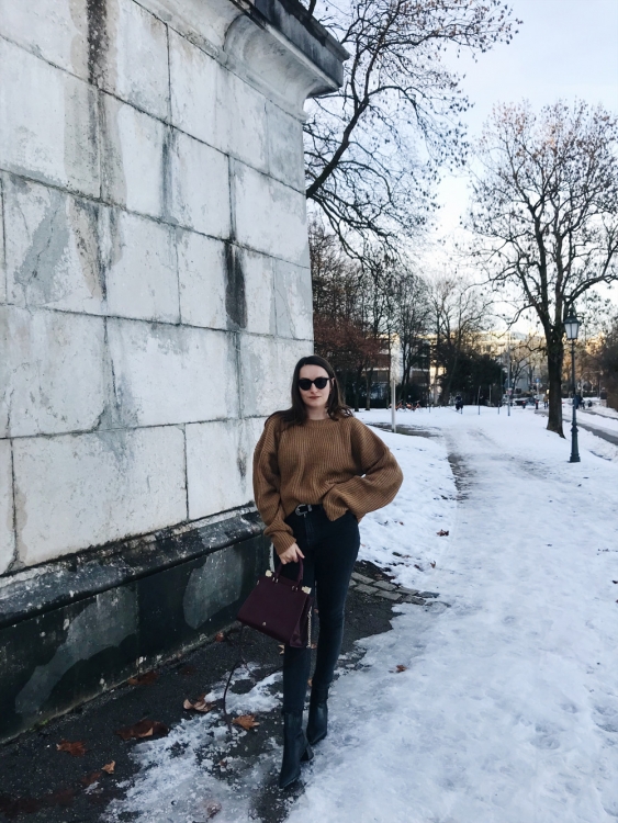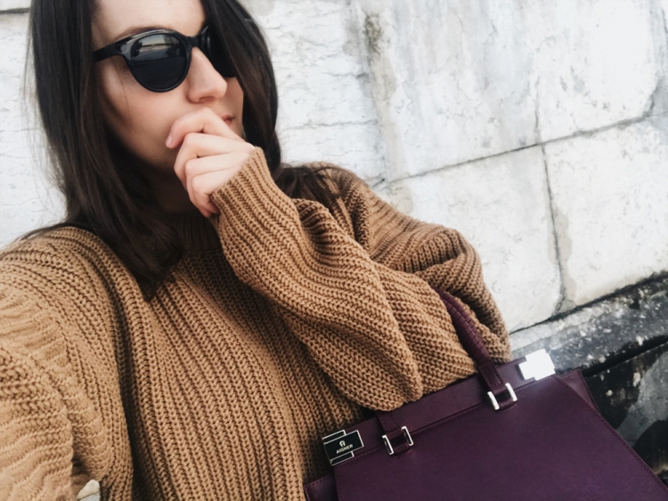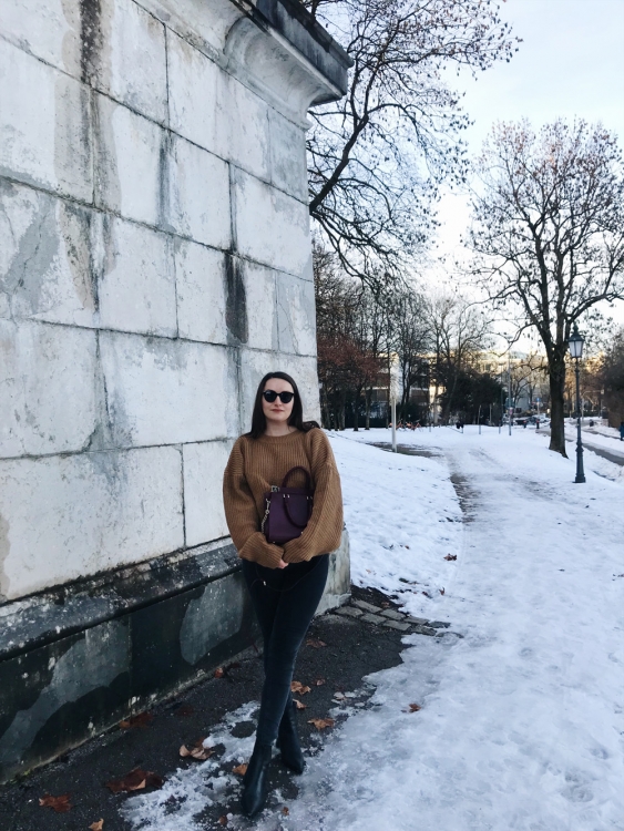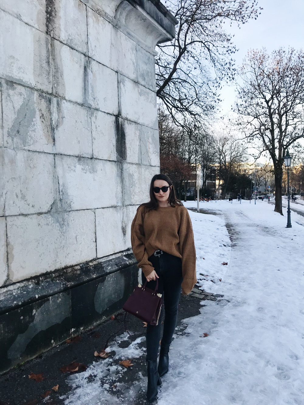 Mantel – Topshop (ähnlicher hier), Pullover – The Odderside (Fair Fashion), Jeans – Weekday (alt, ähnliche hier), Boots – Zara (alt, ähnliche hier), Tasche – thanks to Aigner, Sonnenbrille – Weekday