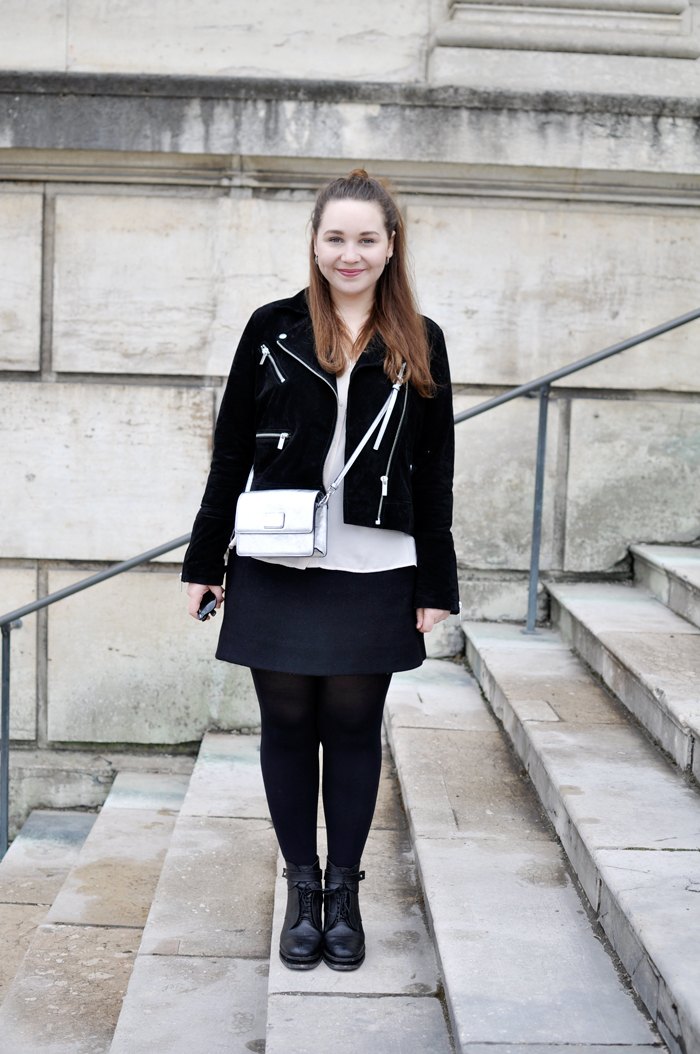 Wildleder-Bikerjacke: Mango (ähnliche hier, hier) / Bluse: H&M (ähnliche hier) / Wollrock: COS (ähnlicher hier) / Schuhe: Purified / Tasche: Marc by Marc Jacobs (ähnliche hier) / Ohrring: Cocii x amazed / Sonnenbrille: Ray Ban 4141