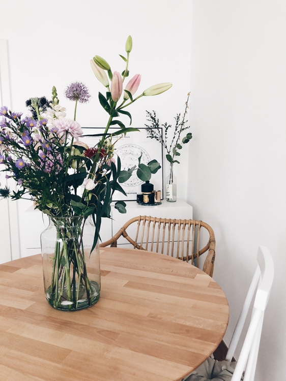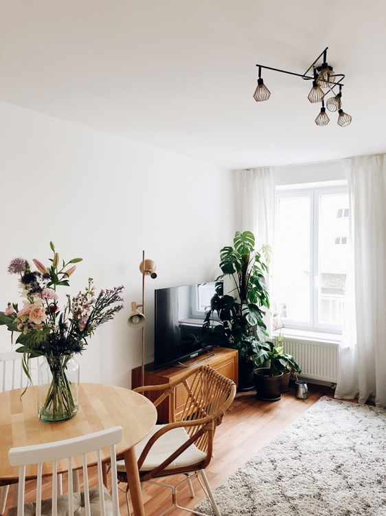 Der Tisch ist mit 100 cm Durchmesser ideal für die relativ kleine Ecke, lässt sich aber auf 130 cm ausziehen, wenn man doch mal mehr Platz braucht. Und das helle Holz ist neben Rattan mein aktuellster Lieblingstrend in Sachen Wohnen, der so wunderbar zu vielen Pflanzen aussieht. Wenn wir außerdem schon bei Rattan wären: Dieser Stuhl durfte zusätzlich noch zweimal bei mir einziehen und ich freue mich so wahnsinnig über diese schönen Stücke, die das Wohnzimmer endlich vollständig gemacht haben. Jetzt, wo alles so dasteht, kann ich mir gar nicht mehr vorstellen, dass es mal anders war – und manchmal braucht es einfach etwas Zeit, bis man die beste Lösung für einen bestimmten Raum findet!
