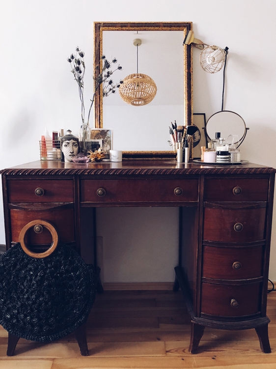 Meine Kameras und das zugehörige Equipment verstaue ich in unterschiedlichen Boxen und habe im Regal auch für die, die ständig in Gebrauch sind, genügend Platz. Im linken Teil des Regals stehen alle meine Taschen, die davor in der ganzen Wohnung verteilt und in ein viel zu kleines Regal gequetscht waren. Mein absolutes Highlight ist allerdings mein neuer Schminktisch, zu dem ich den alten Sekretär meiner Uroma umgewandelt habe. Weil unser Bad nicht überdurchschnittlich groß ist, und ich meinen Freund nicht mit einem Beauty-Overload erschlagen will, ist im Bad nur das, was ich zum Duschen und Baden sowie morgens und abends zur Pflege brauche, alles andere ist im Sekretär verstaut und durch die Schubladen auch noch thematisch geordnet. Von dieser Ordnung habe ich wirklich ewig geträumt!