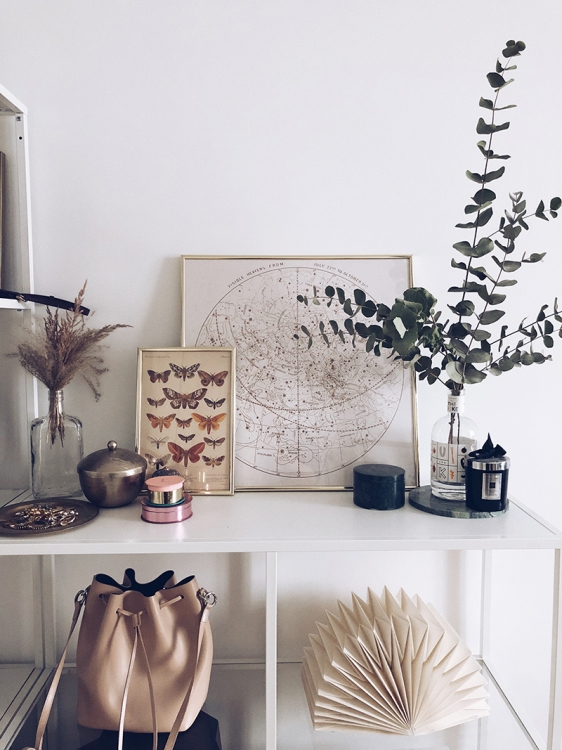Doch es kam bekanntlich anders, und die Wohnung, die wir schließlich gefunden haben, hat ganze vier Zimmer plus Küche, die alle bis auf das Wohnzimmer auch noch ungefähr gleich groß sind. Etwas, von dem ich gar nicht zu träumen gewagt hätte, ging so in Erfüllung: Ein eigenes, großes Arbeitszimmer für mich alleine, in dem ich meine Ruhe und vor allem endlich genug Stauraum für all mein Zeug habe. Durch das Bloggen sammeln sich nämlich vor allem Beautyprodukte an, die ich nun endlich geordnet und übersichtlich verstauen kann, und auch mein Taschen- und Equipmentregal macht mich jeden Tag glücklich. Die Regale, die ich dafür ausgesucht habe, heißen Vittsjö und ich habe euch hier schon Genaueres dazu erzählt. Auf dem halbhohen Regal liegen meine liebsten Ohrringe, außerdem zwei Bilder, die ich mir bei Juniqe aussuchen durfte: Dieses Sternenkarten-Poster und diese Vintage-Schmetterlinge, beide Bilder im goldenen Alurahmen, was meine neue Lieblingsrahmung bei Juniqe ist – die Bilder kann man in unterschiedlichen Rahmungen bestellen und sie werden fertig gerahmt geliefert.