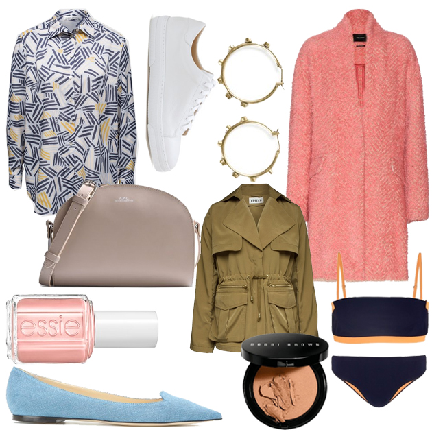 Bluse – Carin Wester, Sneaker – A.P.C., Ohrringe – Isabel Marant, Tasche – A.P.C., Jacke – Edited, Nagellack – Essie, Ballerinas – Jimmy Choo, Bronzer – Bobbi Brown, Bikini-Oberteil – Alexander Wang, Bikini-Unterteil – Alexander Wang, Mantel – Isabel Marant