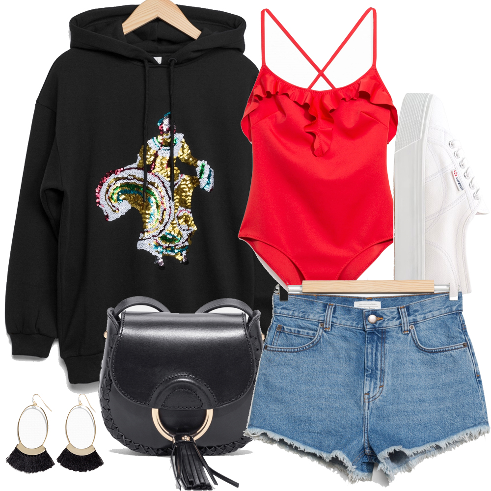 Hoodie – & other stories, Shorts – & other stories, Badeanzug – & other stories, Tasche – & other stories, Sneaker – Superga, Ohrringe – & other stories