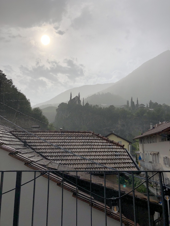 Weil es endlich kühler ist, geht es für uns noch einen Tag auf den Berg: Das Vigiljoch ist Lanas knapp 1800 Meter hoher Hausberg, auf den eine Seilbahn, und dann ein Sessellift fährt. Wir nehmen beide und wandern den Rundweg in der Höhe: Vorbei an Panoramablicken auf die Dolomiten, durch den Wald, an einem kleinen Bergsee vorbei und bis zur San-Vigilo-Kapelle. Wir wandern vom Gipfel hinunter bis zur Seilbahn, und wollen eigentlich ganz bis nach Lana heruntersteigen, da kommt der nächste Regenguss. Das Vigiljoch ist mit seinen vielen Wanderstrecken um den Gipfel herum ein Gebiet, das für jeden gut machbar ist, und das man sich ganz nach der eigenen Tagesverfassung gestalten kann.