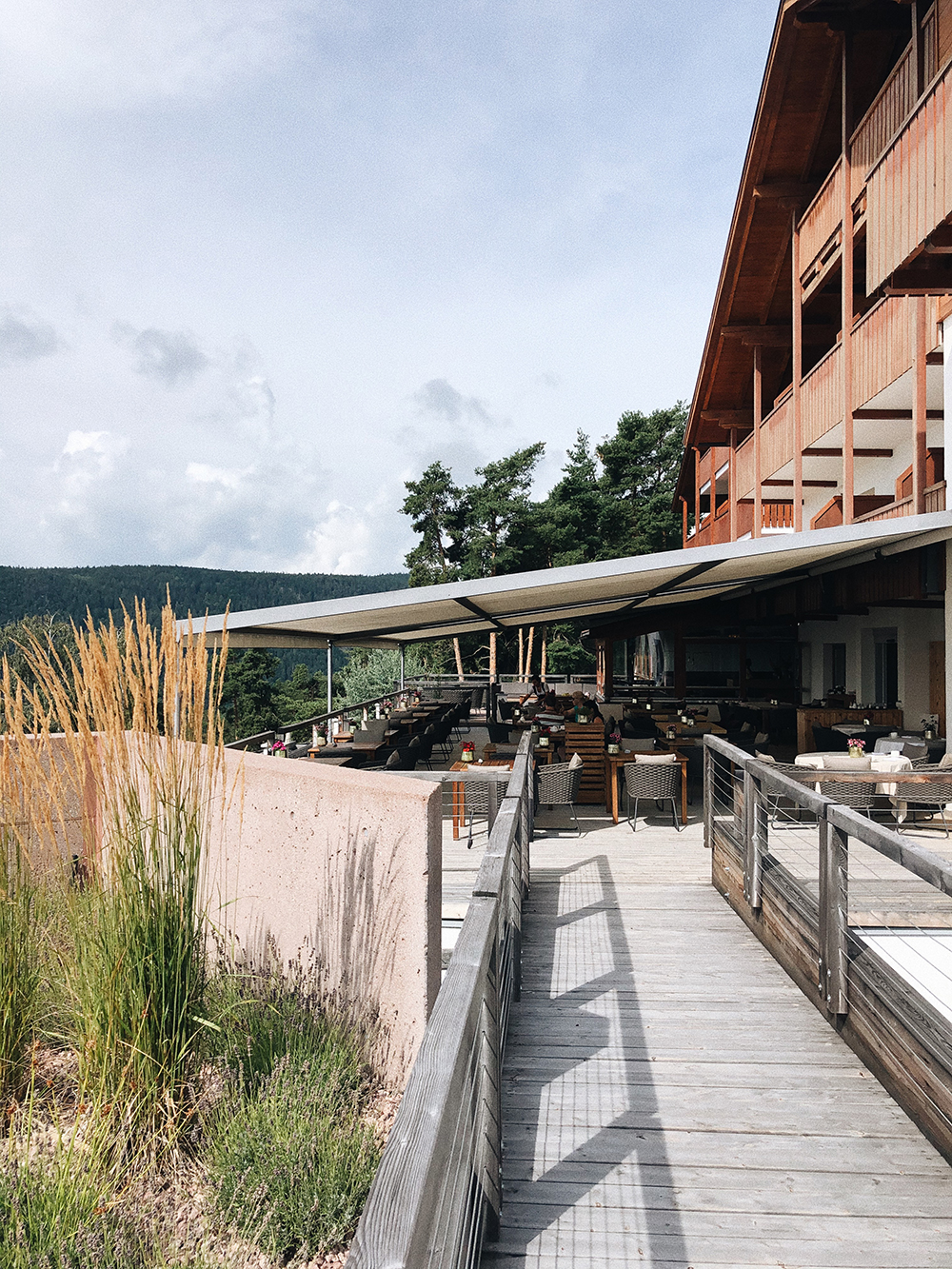 Mit dem Gewitter war plötzlich das erste Herbstgefühl bei mir angekommen, das ich an keinem schöneren Ort hätte spüren können. Am ersten Morgen nahm ich an der Hotel-Yogastunde teil, dann ging es zum Beine vertreten: Auf den Salten, eine Hochebene gleich ums Eck des Hotels und des Dorfs Jenesien, in dem es sich befindet. Das Hotel selbst liegt schon auf 1040 Metern Höhe, wodurch man quasi direkt loswandern kann. Auf dem Salten selbst gibt es einen Sagenweg, der eigentlich für Kinder gedacht ist, den ich aber wahnsinnig schön fand: Immer wieder findet man kleine Tafeln mit Sagen und Märchen aus der Gegend, wie die Sage um eine Butterhexe, die einen Zauberkessel besaß – und in der Bergszenerie werden die alten Geschichten fast schon lebendig. Und auch das Örtchen Jenesien, in dem das Hotel liegt, ist sehr malerisch.