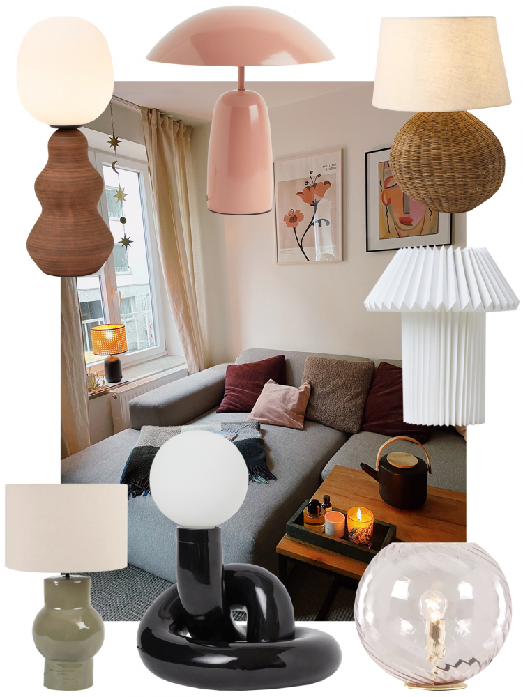 Lampe mit Terrakotta-Fuß / rosa Metall-Lampe / Rattan-Lampe / weiße Papierlampe / runde Glaslampe / schwarze geschwungene Lampe / Lampe mit Keramik-Fuß