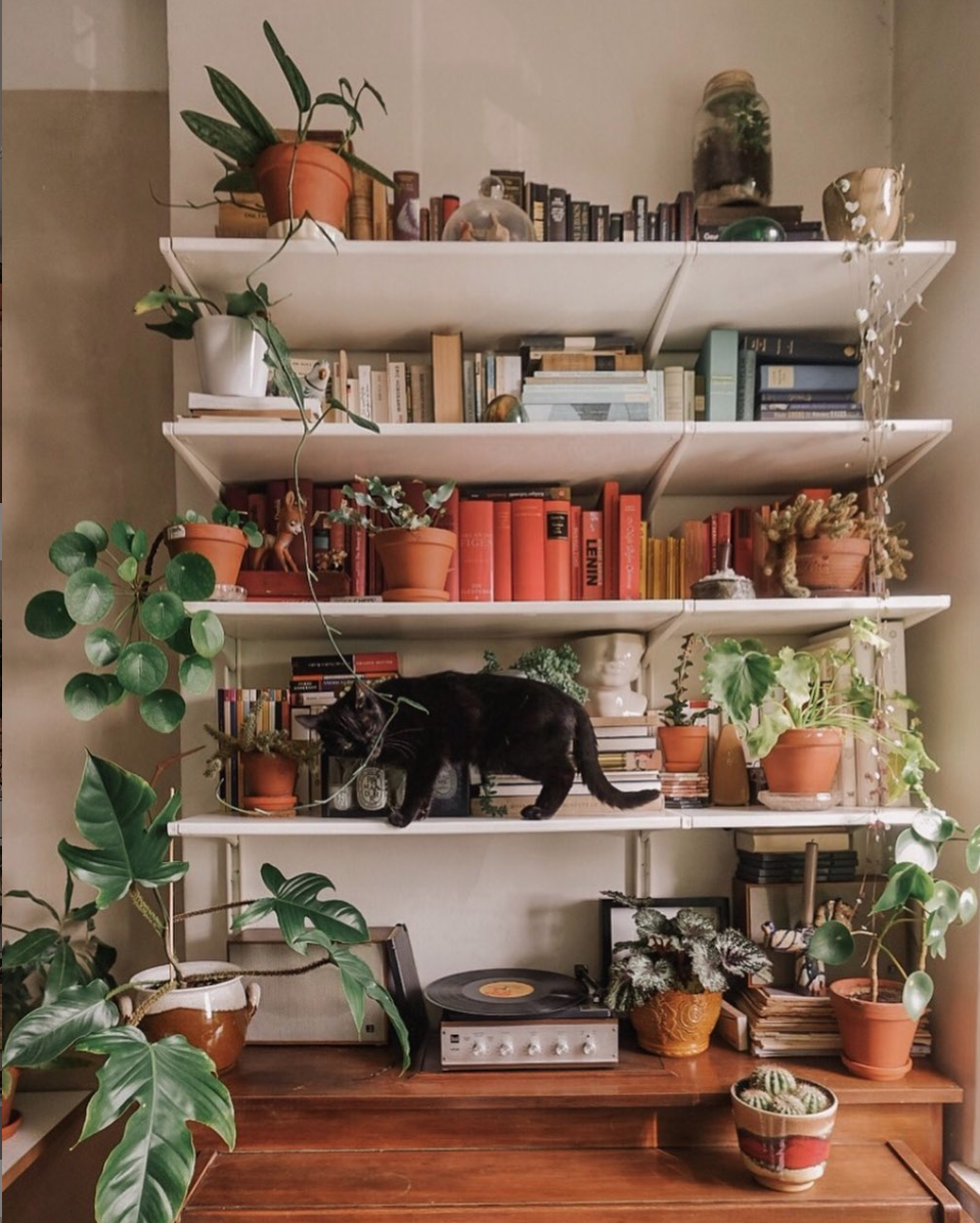 Bücher, Boxen und Schnickschnack in jedem Regalfach wild zu mischen, ist keine gute Idee. Ordentlicher wird es, wenn man Regalfächer thematisch ordnet, in manche nur Bücher stellt, in andere nur ein Dekoteil. Auch hier kann man sich an einheitlichen Farben orientieren – um den „calculated mess“ Effekt nochmal einzustreuen.