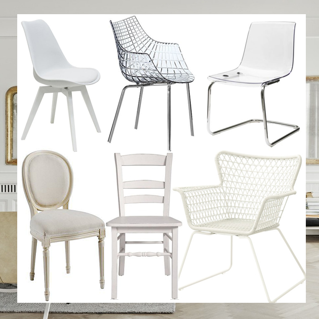 Die Beispiele oben von links oben nach rechts unten: Stuhl mit weißer Sitzschale, transparente Variante 1, transparente Variante 2, cremefarbener Barockstuhl, weißer Holzstuhl, weißer Korbstuhl.