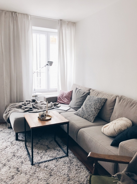 Jetzt, wo das neue Sofa eingezogen ist, habe ich plötzlich Lust, den ganzen Raum umzugestalten. Einen neuen Couchtisch könnte ich mir zum Beispiel sehr gut vorstellen, genau wie einen neuen Teppich. In den letzten Tagen bin ich ins Universum der Kelims und Berberteppiche abgedriftet, und konnte mich gerade noch zurückhalten, 1500 Euro für eines dieser umwerfenden, handgeknüpften Stücke auszugeben. Vielleicht war das Sofa der Anstoß, mal wieder etwas mehr zu verändern – jetzt gibt es aber erstmal ein bisschen Lockdown-Gemütlichkeit auf dem neuen Wohnzimmer-Herzstück!