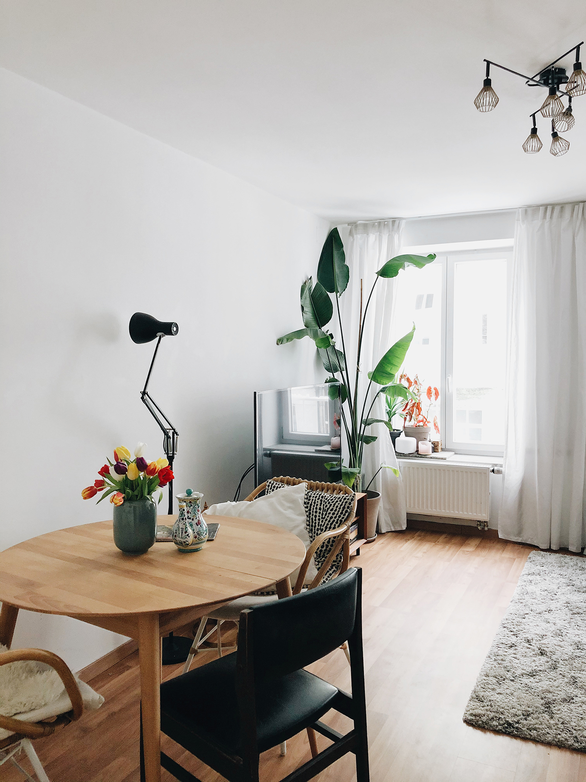 Mit dem Wohnzimmer war ich von Anfang an sehr glücklich – die Bilder sind aus meiner ersten Roomtour aus dem Februar 2018. Mittlerweile haben sich ein paar Dinge verändert, aber das Grundprinzip ist gleich geblieben: Das weiße Ikea Fjälkinge-Regal passte perfekt hinter die Tür und bietet genug Stauraum für all meine Bücher, die große Kochbuchsammlung und mittlerweile auch ein Weinregal. Die weiße Ikea Besta-Kommode habe ich mit Füßen von Prettypegs versehen, und der runde Holztisch ist perfekt für diese Ecke des Raums geeignet: Hier wird zu besonderen Anlässen gegessen, und ansonsten vor allem gespielt, was an einem runden Tisch besonders gut funktioniert.